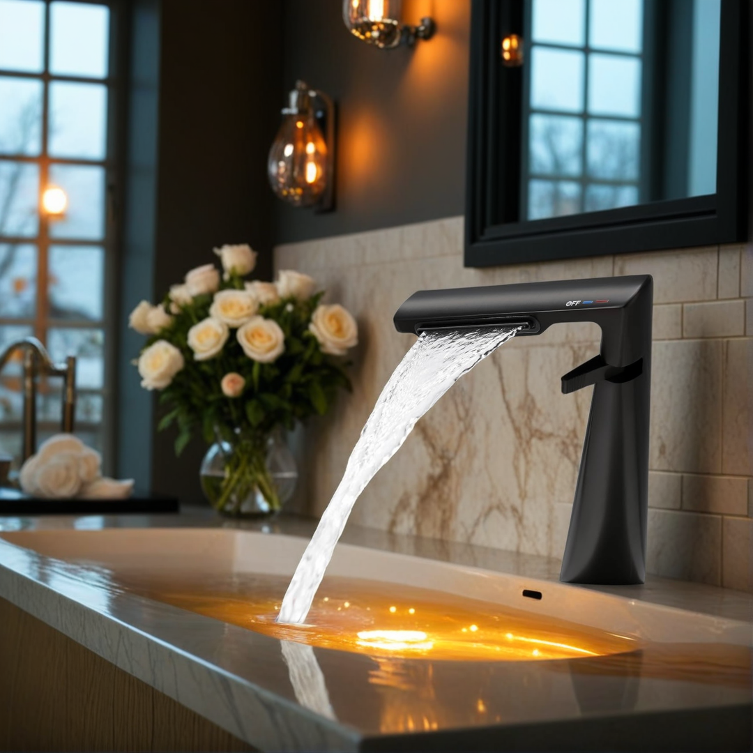 - All-Brass Construction - Crafted from high-quality all-copper material, this waterfall faucet features multi-layer electroplated finish that enhances its resistance to rust and limescale, keeping the faucet stay looking sleek and clean