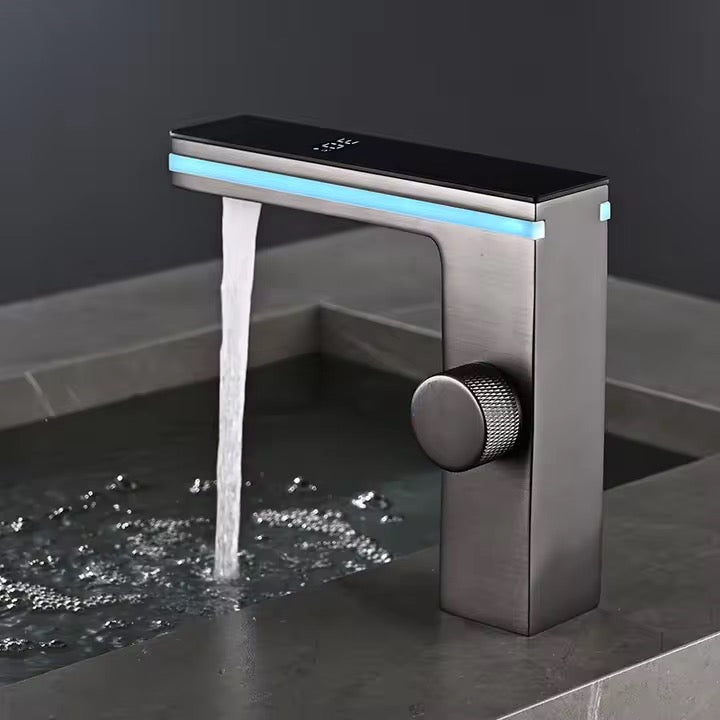 Upgrade your bathroom with the elegance of innovation. This Modern Touch Sensor LED Bathroom Faucet is the perfect fusion of luxury design and smart functionality. The sleek matte grey finish and right-angle shape give it a modern industrial appeal, while the integrated touch sensor and LED temperature indicator add a layer of intelligent technology. Turn water on and off with a simple tap on the top – no need to touch knobs with dirty hands. The color-changing LED light indicates water temperature in real-time, helping prevent scalds or surprises. Adjust water flow and temperature smoothly using the precision side knob. Built with high-grade brass and finished for maximum rust resistance, this faucet is engineered for both performance and aesthetics. Whether you're renovating a home or outfitting a modern apartment or hotel, this faucet elevates the look and usability of your bathroom instantly.