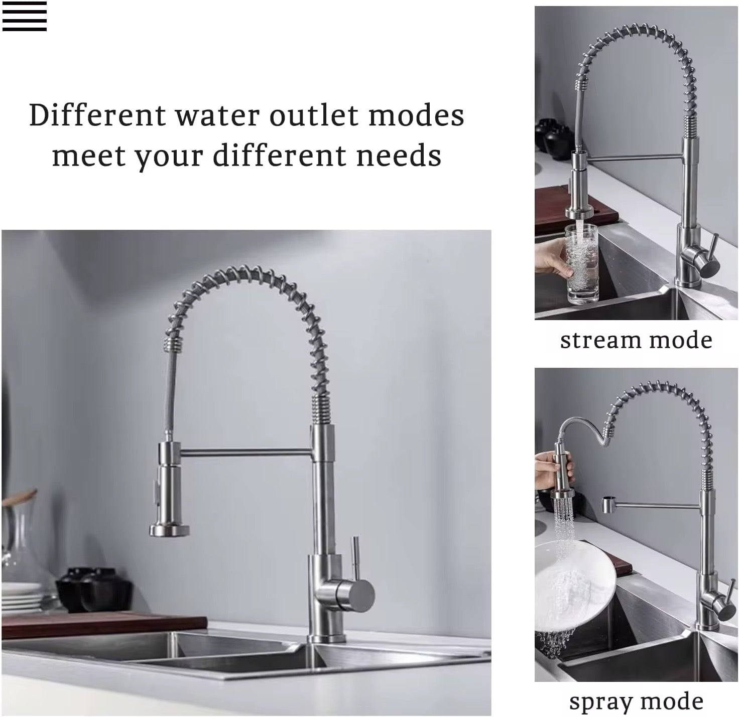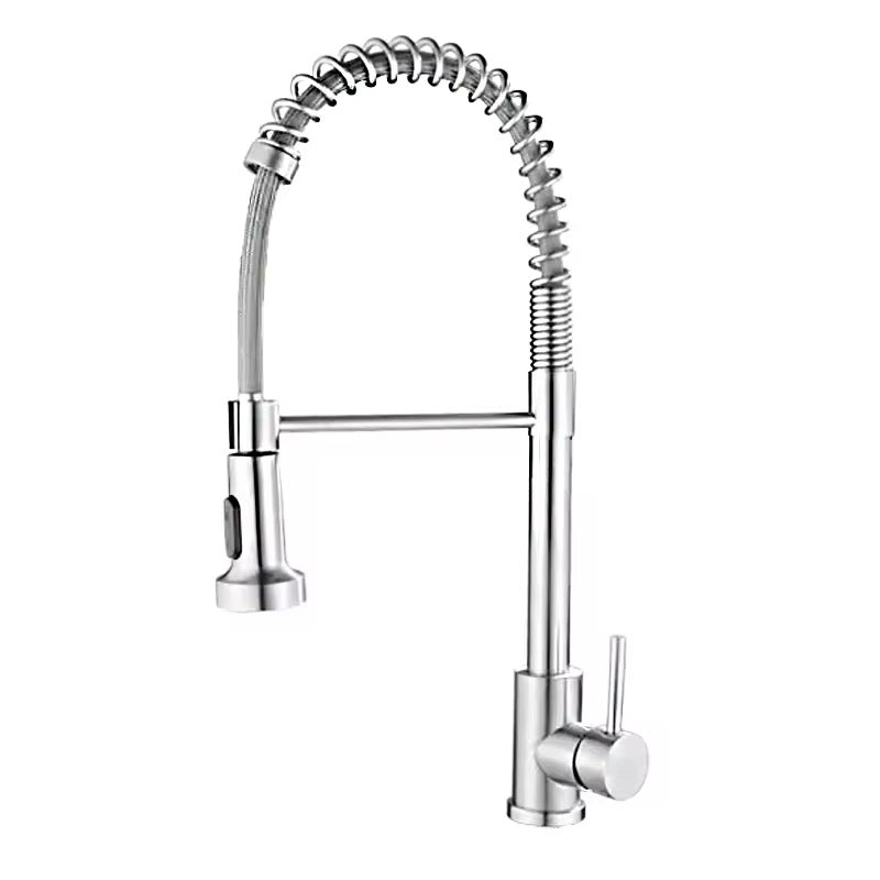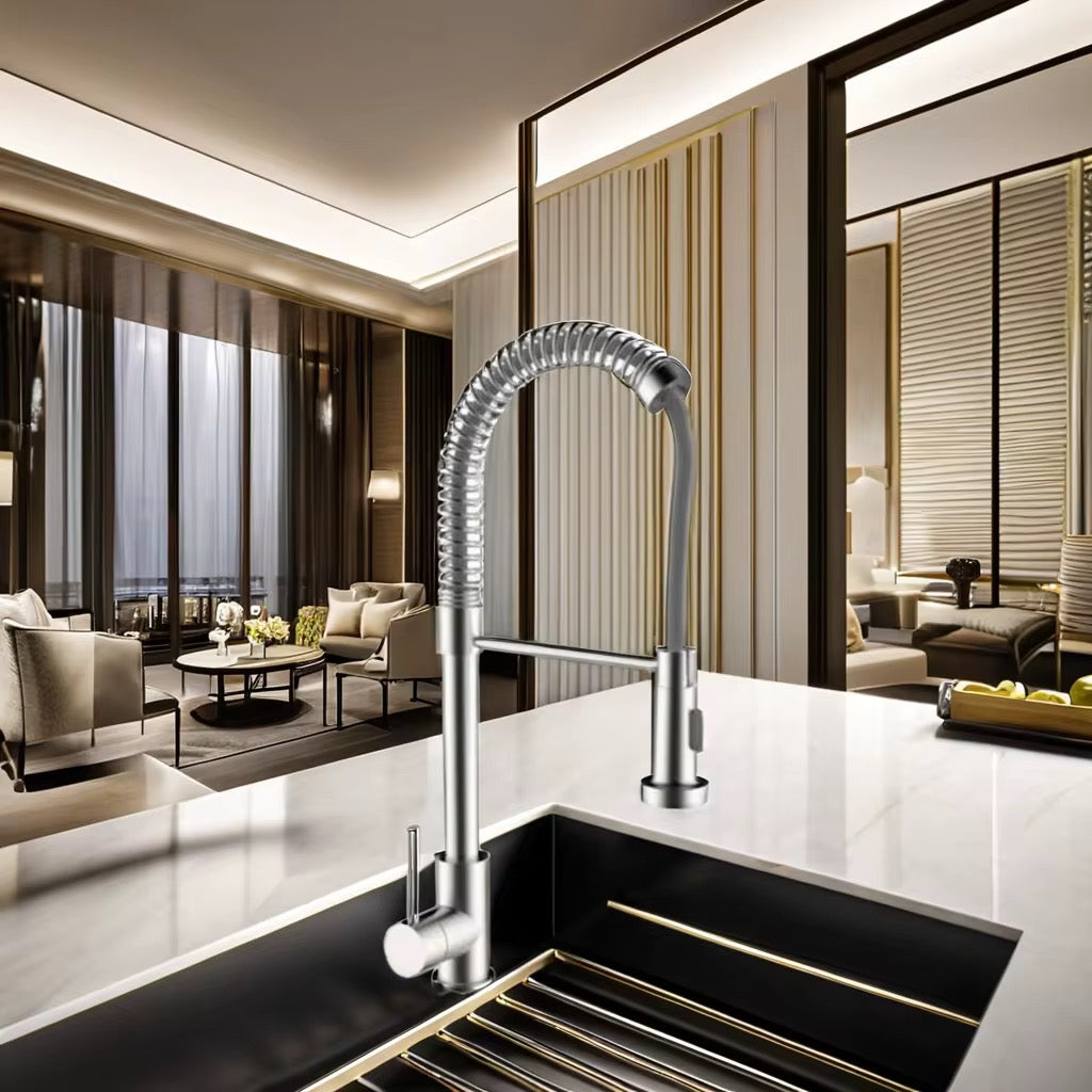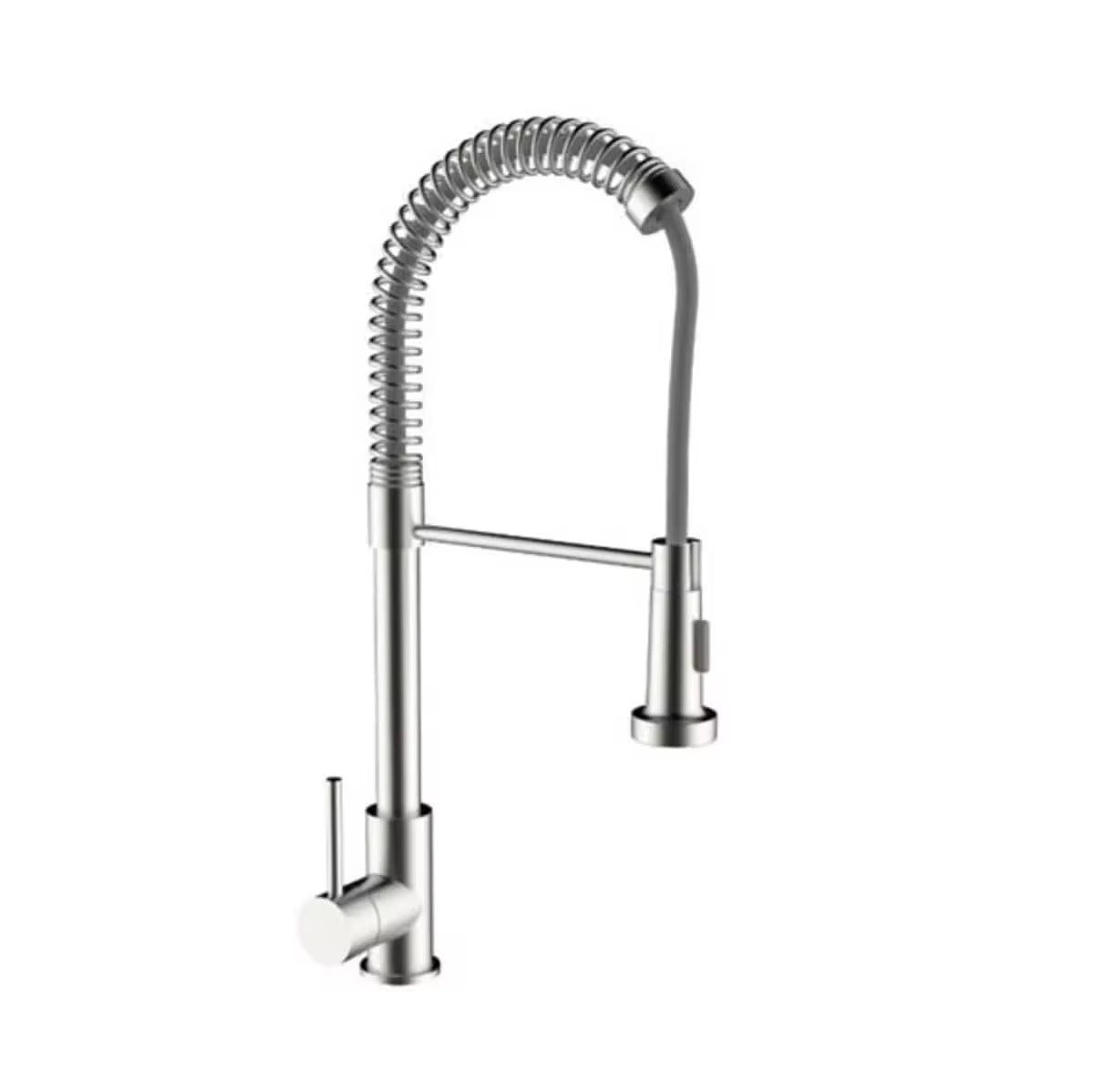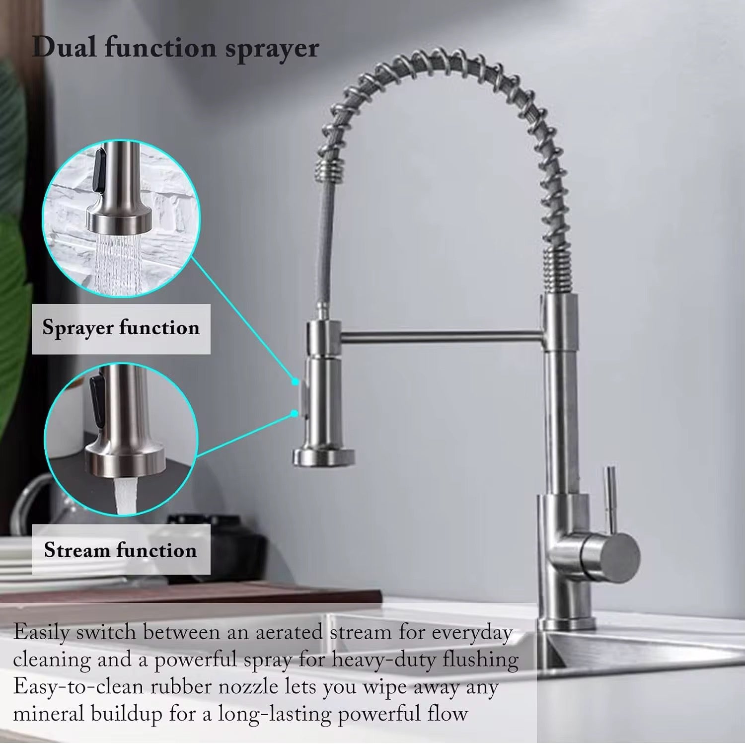 Upgrade your kitchen with this commercial-grade dual-function faucet designed for both residential and professional use. With a sleek brushed nickel finish and industrial-style spring design, it adds modern sophistication to any space. The dual-mode sprayer toggles between a steady stream and powerful spray to meet all your kitchen needs – from rinsing veggies to blasting away tough food debris.