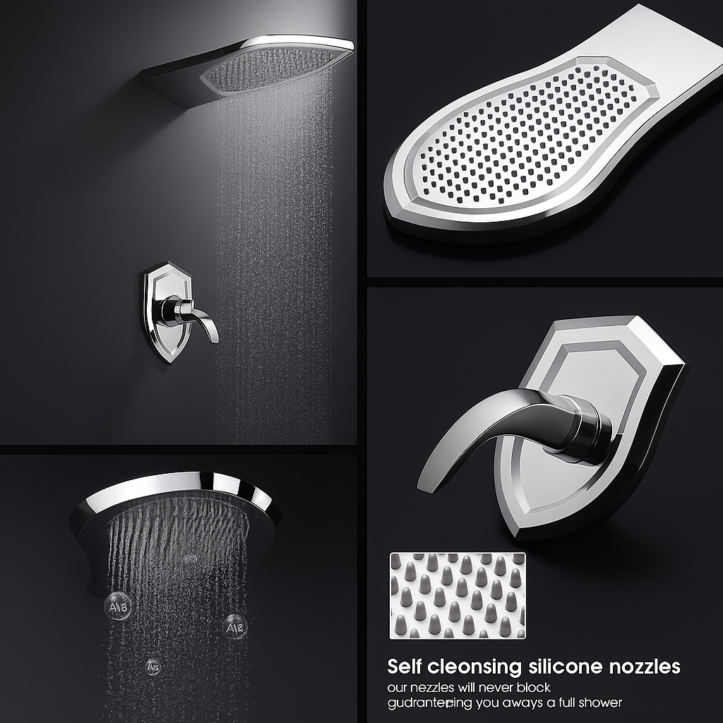 Stand out with a bold, elegant shield-shaped valve and showerhead — perfect for luxury bathrooms, modern homes, and upscale renovations.