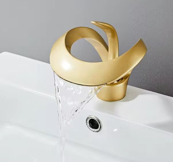 Elevate your bathroom aesthetics with this luxury waterfall faucet featuring an artistic and sculptural design. The brushed gold finish enhances any modern or glam bathroom, while the wide waterfall spout creates a calming and spa-like ambiance.