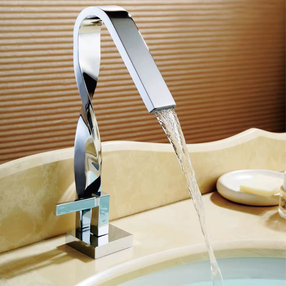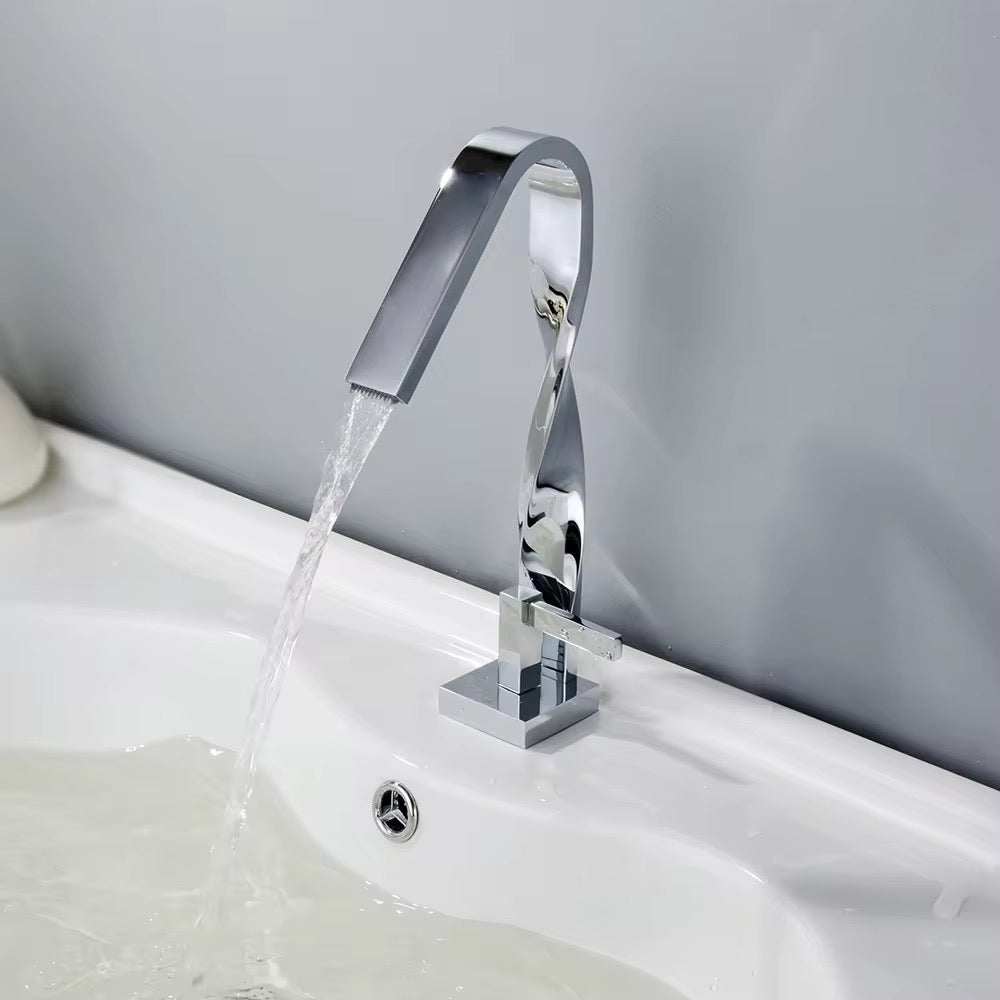Upgrade your bathroom with this bold and elegant Modern Chrome Single-Handle Bathroom Faucet. Crafted with a distinctive twisted neck and sharp rectangular lines, this faucet brings a sculptural element to your vanity space. The tall, waterfall-style spout offers a smooth and calming stream of water, perfect for vessel sinks or high-end washbasins.