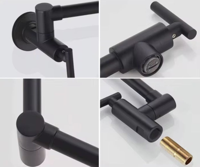 Upgrade your kitchen with our premium Wall Mount Pot Filler Faucet, designed for both style and practicality. Crafted from heavy-duty solid brass and finished in elegant matte black, this faucet resists corrosion and adds a touch of modern sophistication to your cooking space. Its 360° swivel arms and double joint folding design provide the convenience of filling pots directly on the stove while easily folding away when not needed. Ideal for both residential and commercial kitchens, the pot filler combines ergonomics, durability, and ease of use in one compact fixture. Installation is a breeze with the included complete mounting kit. Whether you're a home cook or a professional chef, this faucet transforms your kitchen into a more efficient workspace.