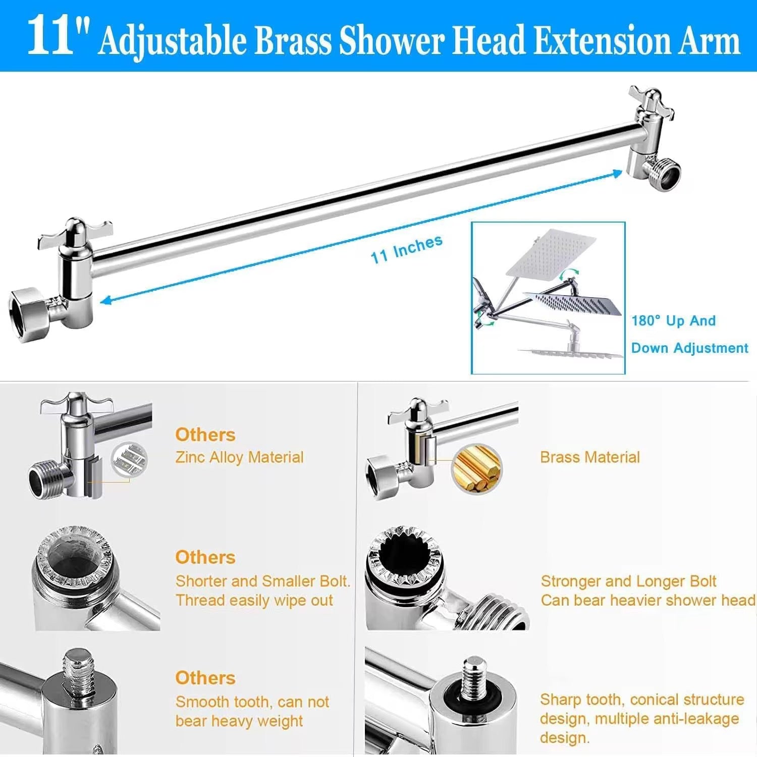- [Brass Adjustable Extension Arm] - 11”Adjustable extension shower arm fits any shower head or hand shower. It’s made from sturdy brass, allows you to adjust the showerhead for best angel and height to meet all your needs. 2-Foot vertical movement range makes it easy to tight the joint.