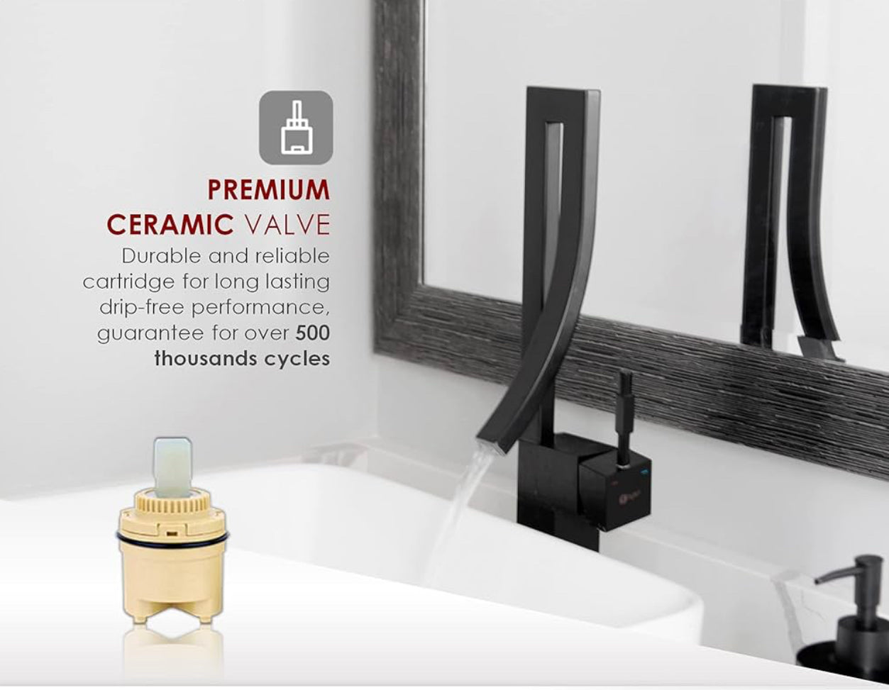 - CERAMIC CARTRIDGE: Tested for 500,000 times open-close test. This bathroom faucet is made using top-quality components. A ceramic cartridge for reliable drip-free use and a best-in-industry aerator to reduce water waste without compromising pressure.