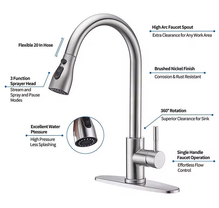 Make your kitchen smarter and cleaner with this touch-activated kitchen faucet. Featuring a modern brushed nickel finish, this faucet combines beauty with convenience. The touch control lets you start or stop the water flow with a simple tap—no need to use dirty hands. The pull down sprayer offers three modes (stream, spray, pause), while the high arc spout and 360° rotation give you complete freedom and space to work. The 20-inch flexible hose makes every task—from rinsing produce to filling large pots—fast and efficient. Upgrade your sink with this functional, stylish, and user-friendly faucet.